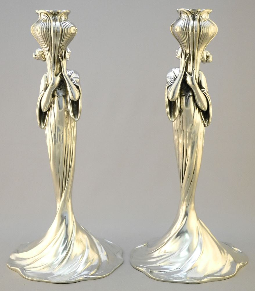 LOT 26 Pair of Polished Pewter Art Nouveau Figural Candlesticks, 12" high. Estimate: $300 - $400 Sold For: $380 Auction Date: Tuesday, October 19 2021 at 7:00 PM