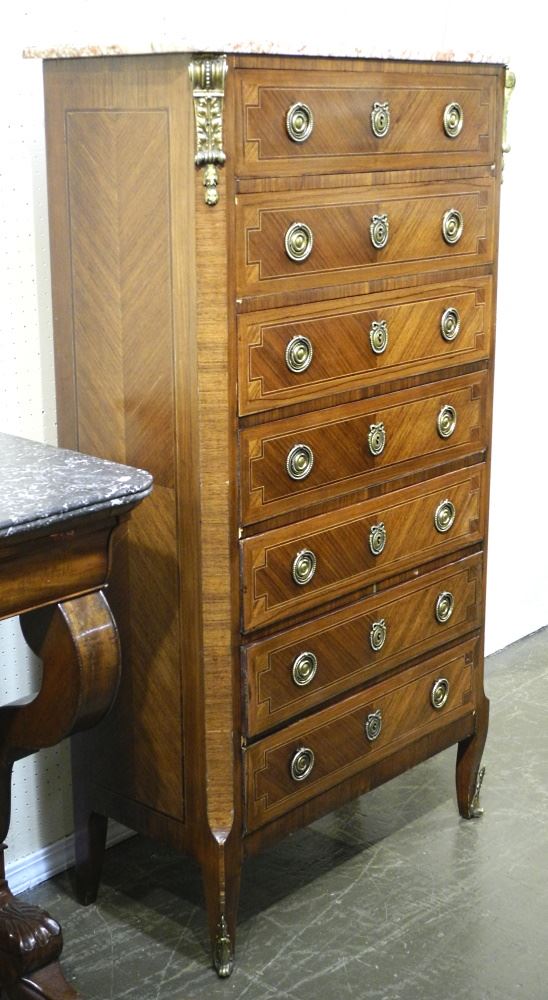 LOT 38 French Empire Semainier, 57 7/8" high, small losses. Estimate: $300 - $500 Sold For: $360 Auction Date: Tuesday, October 19 2021 at 7:00 PM