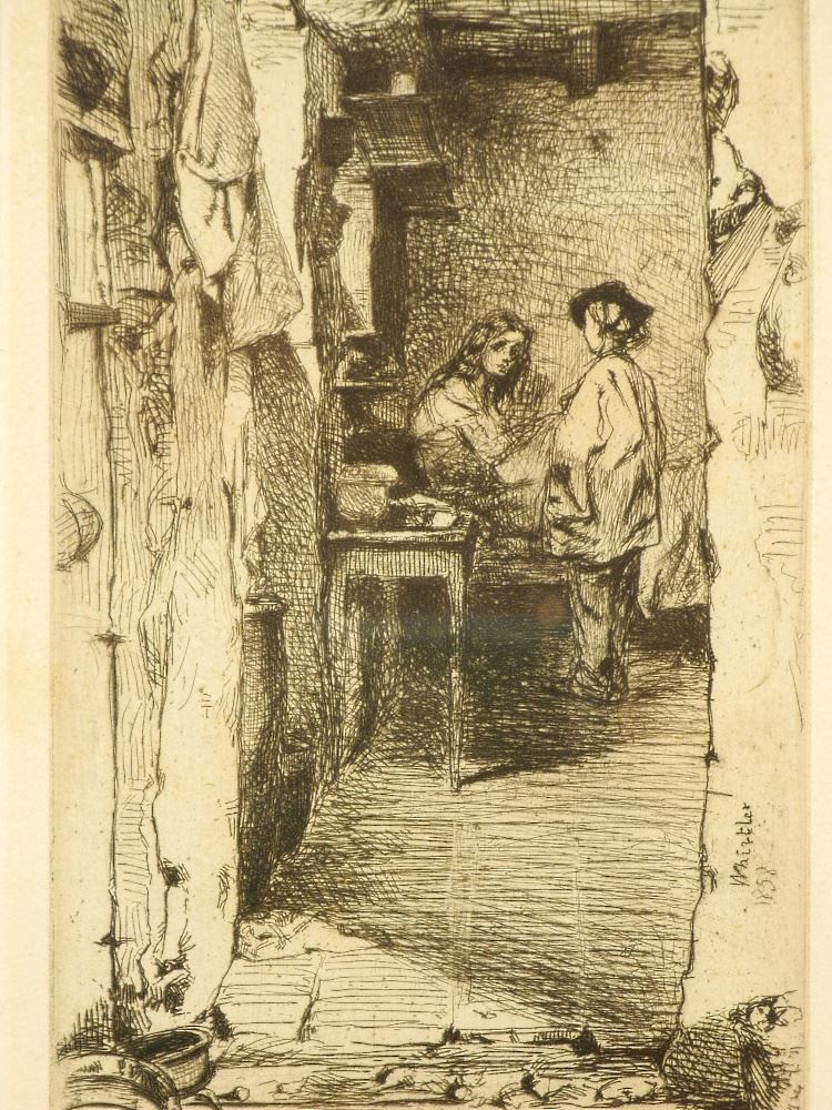 Etching signed (J.A.M.) Whistler, 6" x 3 1/2", "The Rag Gatherers".