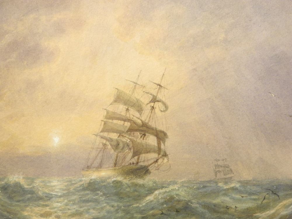 Watercolour signed J. Harris (Jr), 7 1/2" x 12 7/8", "Tall Ship Daybreak".