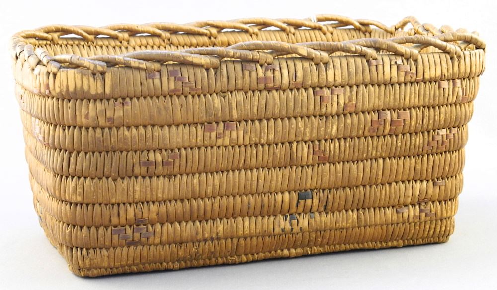LOT 67 Salish Oblong Basket with Braided Rim, 10 1/4" length. Estimate: $100 - $150 Sold For: $80 Auction Date: Tuesday, December 14 2021 at 6:00 PM