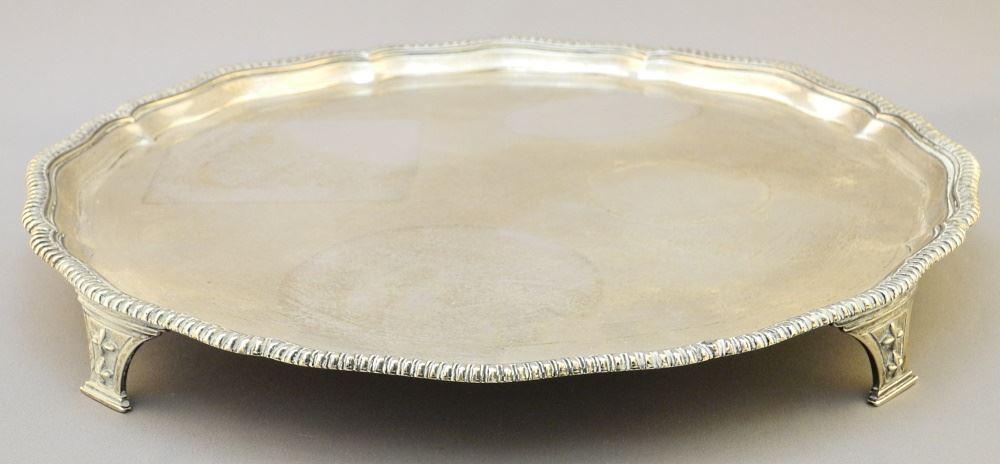 LOT 40 Hallmarked Silver Salver/ TB & S/ Sheffield/ 1932, 12 1/8" diameter. Estimate: $300 - $400 Sold For: $700 Auction Date: Tuesday, December 14 2021 at 6:00 PM