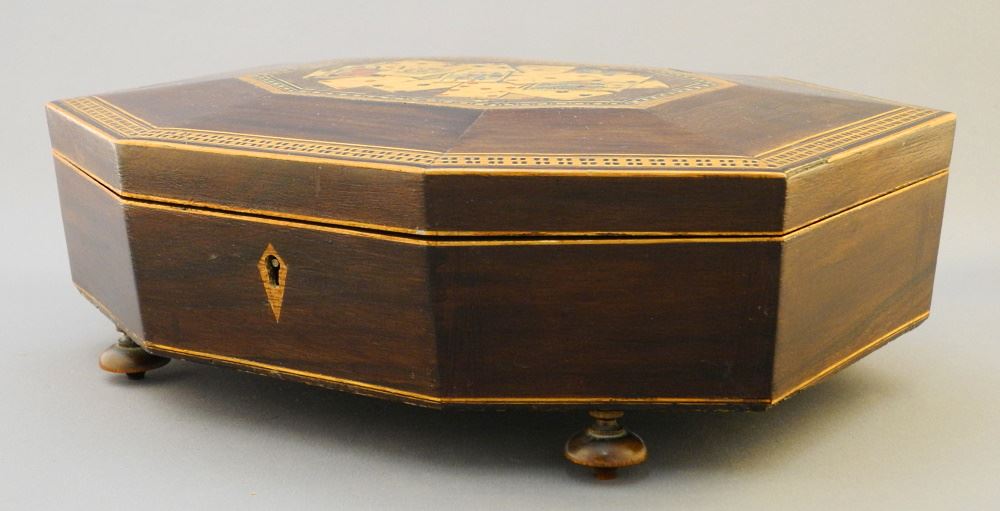 Hall & Son Inlaid Octagonal Box, 10 1/2" wide & a Mauchline Ware Box, 4 1/2" wide.