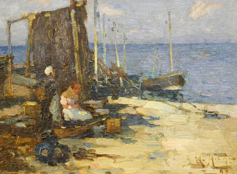 Oil on Canvas Signed W.(William) Milne, 9 1/2" x 13 1/2", "A Fishing Harbour".