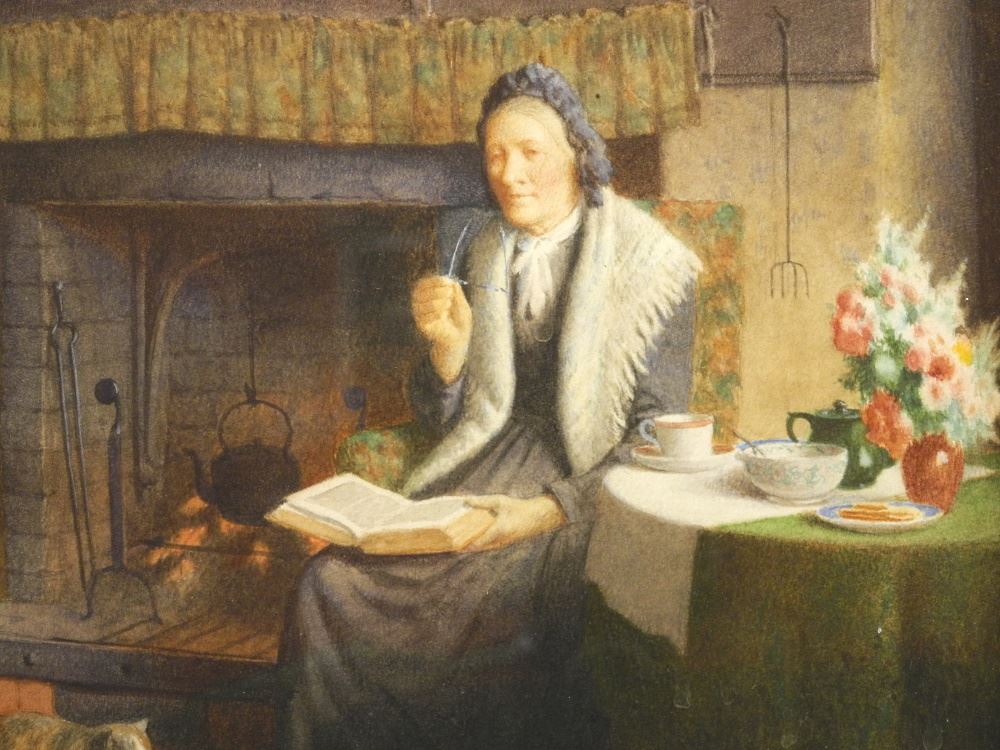 LOT 8 Watercolour Signed H.S.(Henry) Tozer 192*, 8 3/4" x 12 3/4", "Lady with Cat". Estimate: $300 - $500 Sold For: $400 Auction Date: Tuesday, February 15 2022 at 6:00 PM