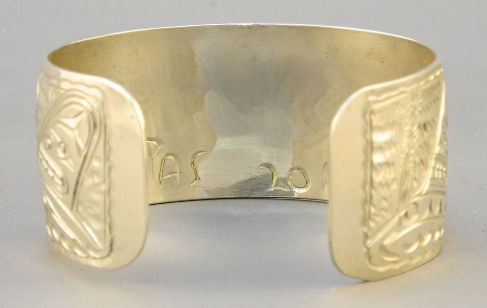 LOT 37 Kwagiulth Silver Orca Bracelet Monogrammed PAS (Pat Seaweed) 2019, 1 1/4" Wide. Estimate: $250 - $350 Sold For: $400 Auction Date: Tuesday, February 15 2022 at 6:00 PM