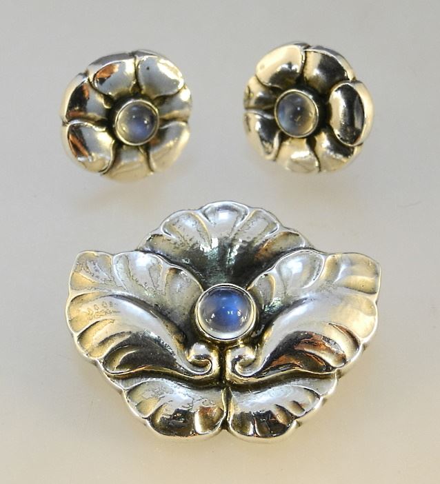 Georg Jensen Sterling Silver & Moonstone Brooch & Earring Set, #30 & 36.