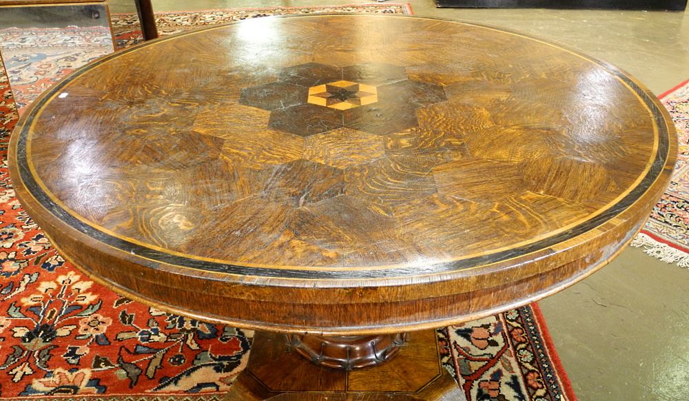 Regency Parquetry Oak & Specimen Timber Center Table, 46 3/4" diameter.