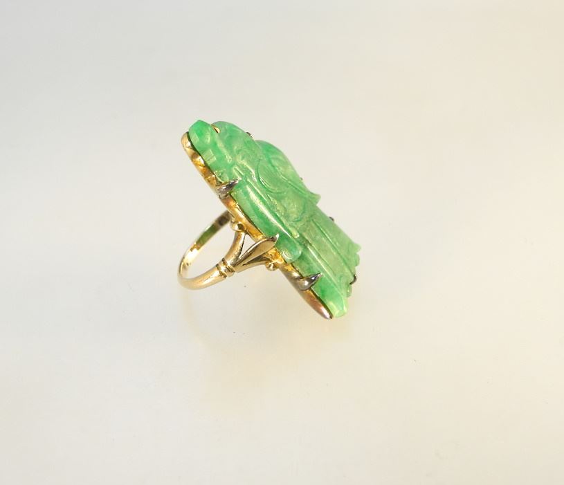 LOT 39 Natural Jadeite Jade "Shou Lao" Ring in Gold Tone Setting. Estimate: $250 - $350 Sold For: $280 Auction Date: Tuesday, February 15 2022 at 6:00 PM