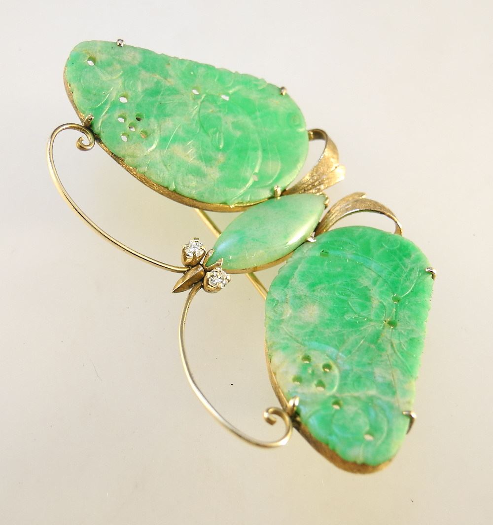 Natural Jadeite & Diamond Jade "Butterfly" Brooch in 14K Yellow Gold Setting.