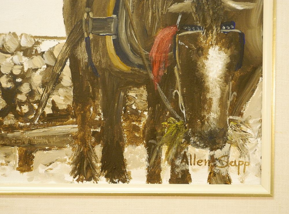 LOT 46 Oil on Canvas signed Allen Sapp, 17 1/2" x 23 1/2", "A Break From Cutting Logs". Estimate: $3,000 - $4,000 Sold For: $3,000 Auction Date: Tuesday, October 04 2022 at 6:00 PM