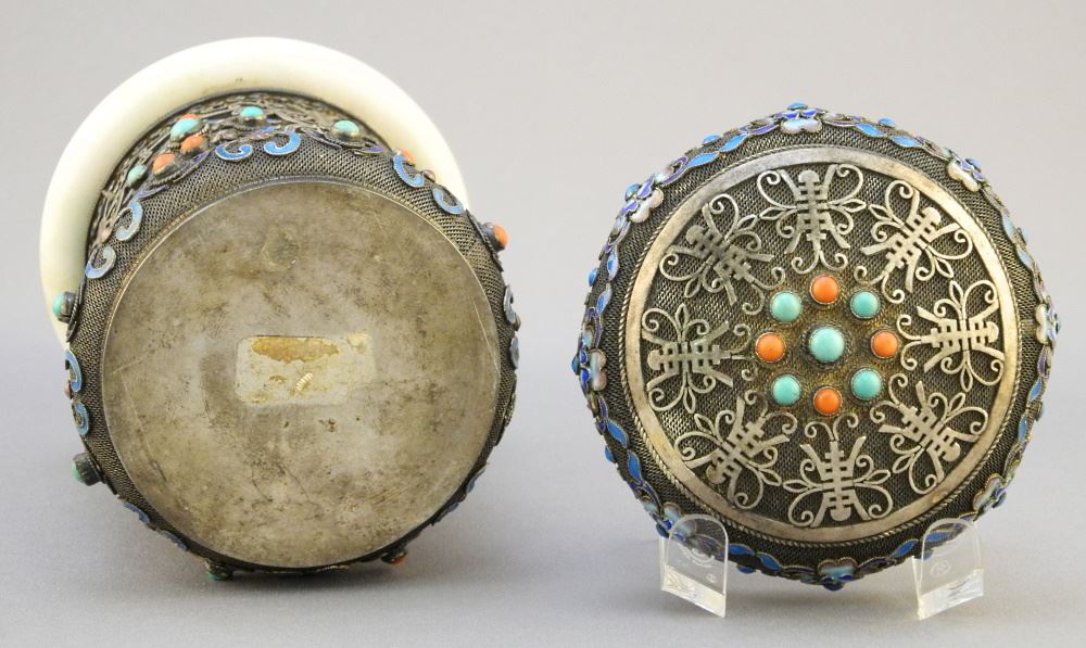 LOT 149 Chinese Filigree Silver Enamel Coral & Turquoise Covered Jar with Jade Bangle, 4 5/8", Marked. Estimate: $500 - $1,000 Sold For: $700 Auction Date: Tuesday, October 04 2022 at 6:00 PM