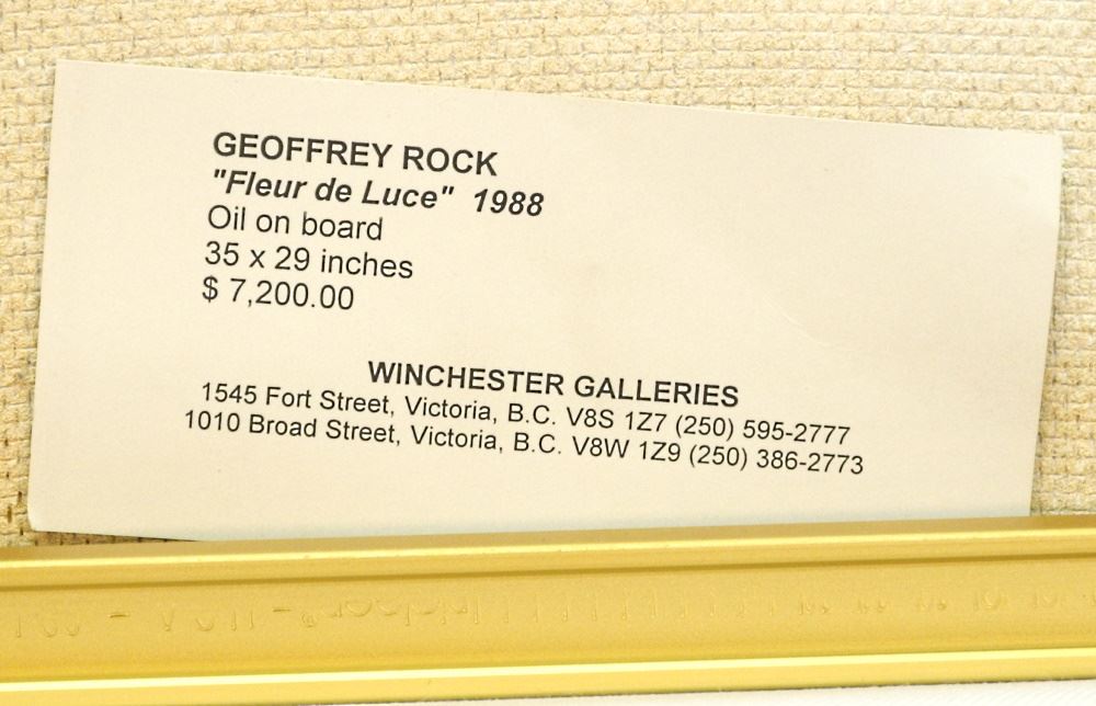 LOT 18 Oil on Board signed Geoffrey Rock, 35" x 29", "Fleur de Luce". Estimate: $750 - $1,250 Sold For: $1,500 Auction Date: Tuesday, October 04 2022 at 6:00 PM