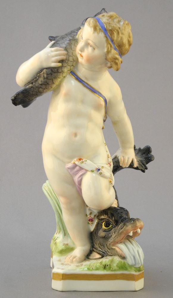 Berlin Porcelain Figurine, Putti, Fish & Dolphin, 7 3/4" High, Under- glaze Blue Sceptre Mark.
