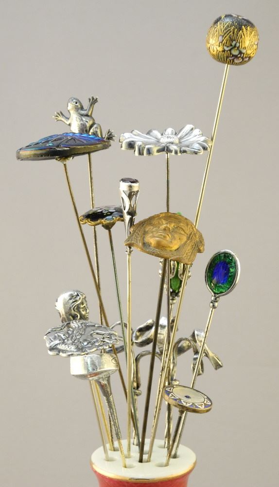 Collection of Various Hat Pins with KPM Porcelain Holder: Silver/ Glass/ Enamel, 5 1/8" High.