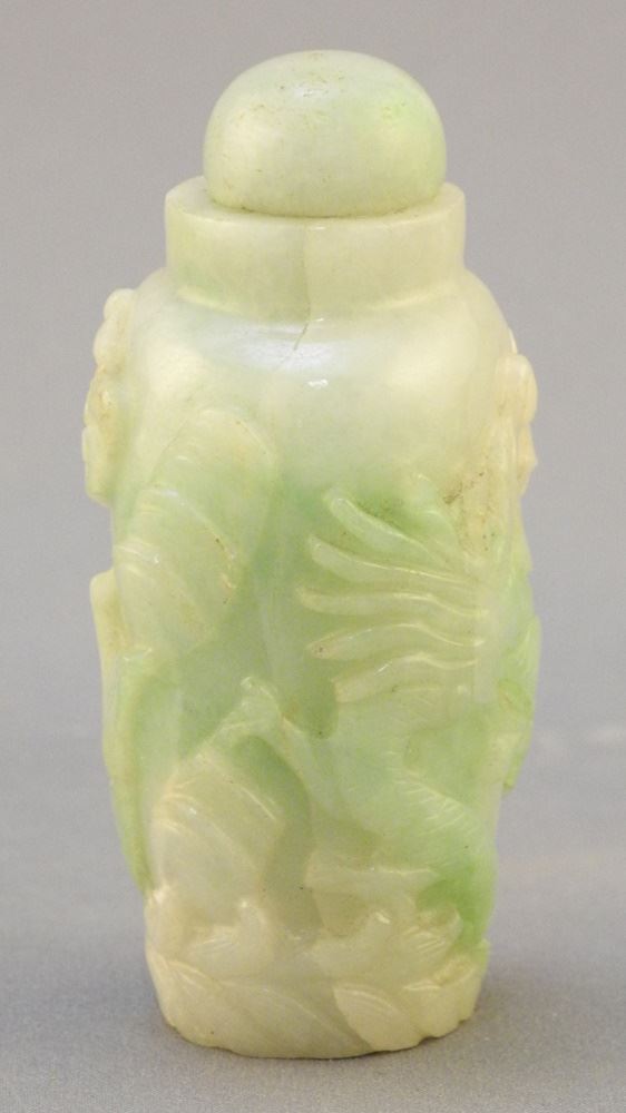 Chinese Pale Green Hardstone "Fish & Dragon" Snuff Bottle, 2 1/2"H.