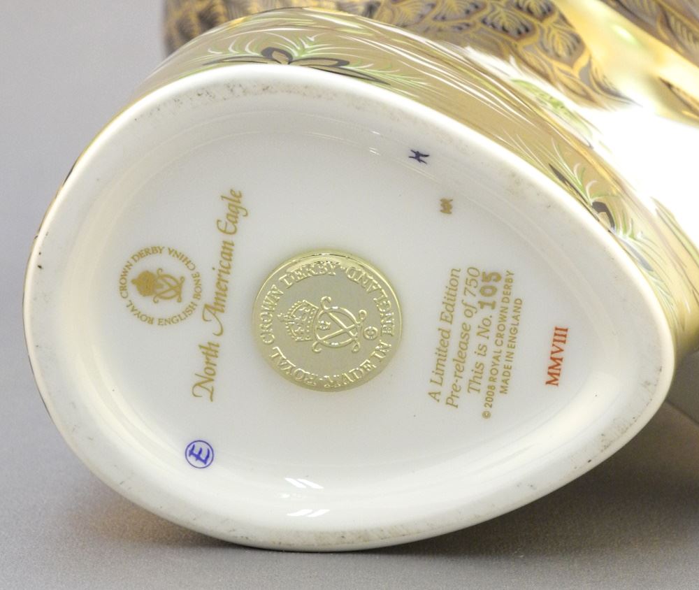 LOT 134 Royal Crown Derby Limited Edition "North American Eagle", #105/750, 8 1/8" High. Estimate: $150 - $200 Sold For: $130 Auction Date: Tuesday, February 28 2023 at 4:00 PM