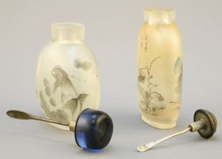 2 Chinese Reverse Painted Glass Snuff Bottles "Goldfish" & "Grasshopper" 2 5/8"x2 3/4