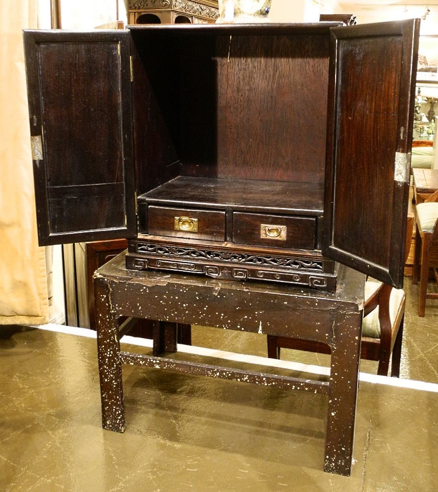 Chinese Rosewood Double Door Cabinet With Two Drawers On Lacquer Stand, Cabinet 21" x 17 1/2" x 12