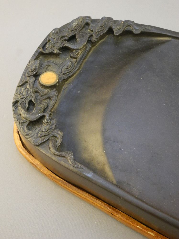 Tuan "Dragons" Inkstone with Wood Base & Cover, 3" X 9 5/8" X 7".