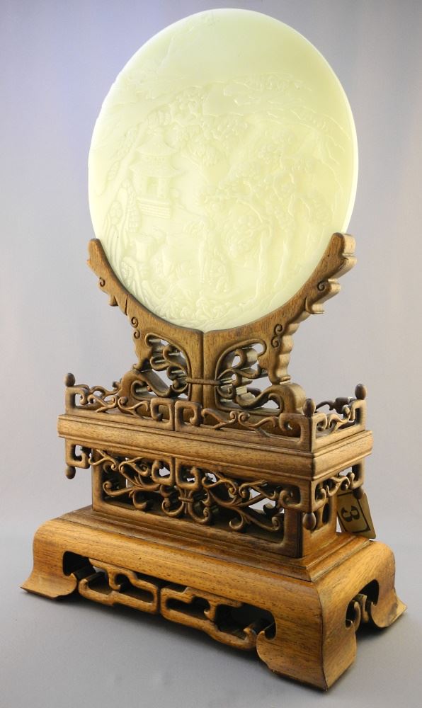 LOT 13 Jade "Landscape" Roundel (10 3/8" Diameter) Supported Upon Elaborate Wood Base 20x12x6". Estimate: $2,000 - $4,000 Auction Date: Tuesday, April 25 2023 at 4:00 PM