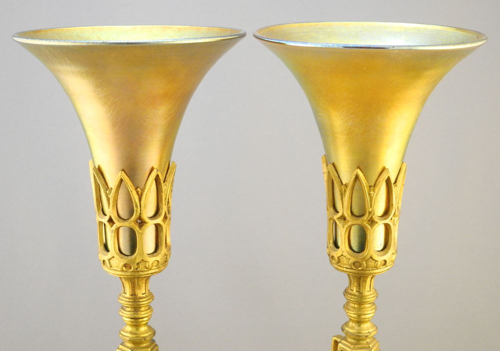 LOT 6 Pair of Cast Gilt Metal Mantle Lamps with Conical Iridescent Shades, 15"h - rubbed spot Estimate: $500 - $750 Sold For: $650 Auction Date: Tuesday, April 25 2023 at 4:00 PM