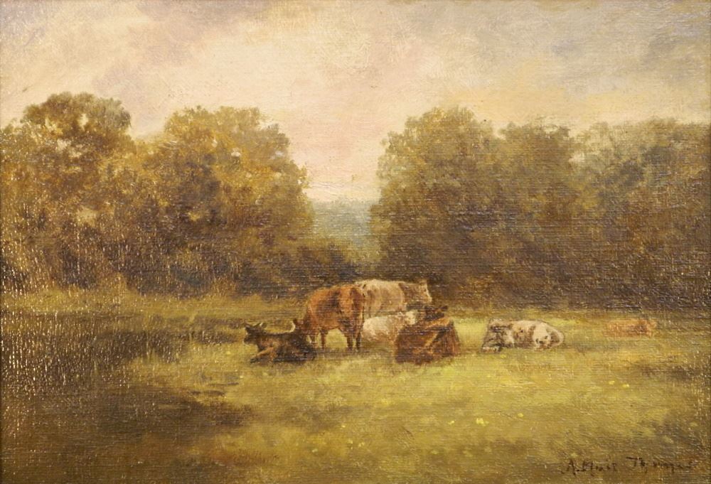 LOT 86 Oil on board Signed A (Alice) Blair Thomas, 6 5/8" x 9 1/2", "Cows at River". Estimate: $200 - $400 Sold For: $225 Auction Date: Tuesday, April 25 2023 at 4:00 PM