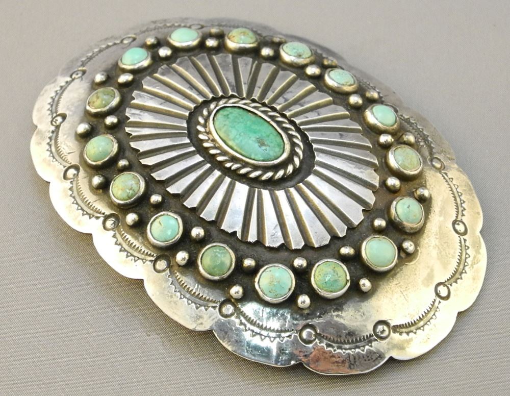 LOT 97 Navajo Silver and Turquoise Concho Brooch, 2 1/2" x 3 1/2". Estimate: $300 - $400 Auction Date: Tuesday, April 25 2023 at 4:00 PM