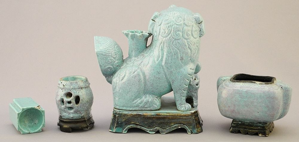 4 Chinese Robin's Egg Blue Wares: Lion Dog (4 1/2" High), Brush Washer & 2 Snuff Stands