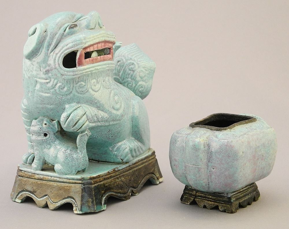 LOT 83 4 Chinese Robin's Egg Blue Wares: Lion Dog (4 1/2" High), Brush Washer & 2 Snuff Stands Estimate: $150 - $200 Sold For: $140 Auction Date: Tuesday, August 29 2023 at 4:00 PM