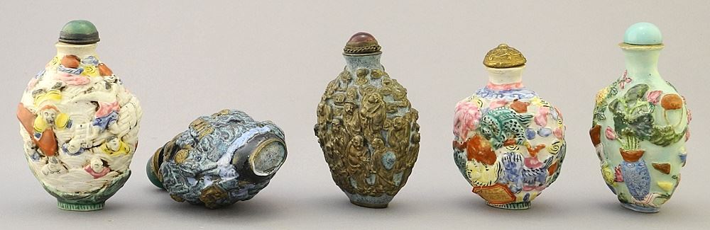 LOT 136 5 Chinese Molded Porcelain Snuff Bottles, Small chips noted on two, 2 1/2" - 2 7/8" High. Estimate: $300 - $500 Sold For: $650 Auction Date: Tuesday, August 29 2023 at 4:00 PM