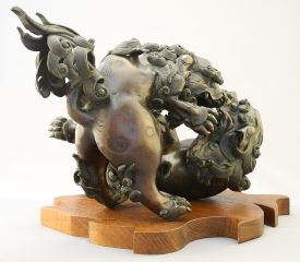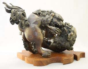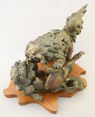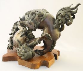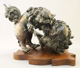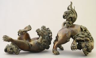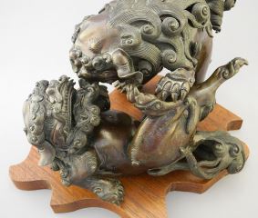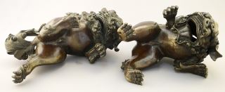 Pair of Japanese Copper Alloy Buddhist Lion Dogs at Play, 9 3/8" x 9" x 8" (variable).