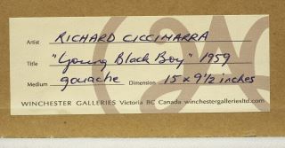 LOT 58 Gouache on Paper signed R (Richard) Ciccimarra, 15" x 9 1/2", "Young Black Boy". Estimate: $1,500 - $2,000 Sold For: $1,500 Auction Date: Tuesday, August 29 2023 at 4:00 PM