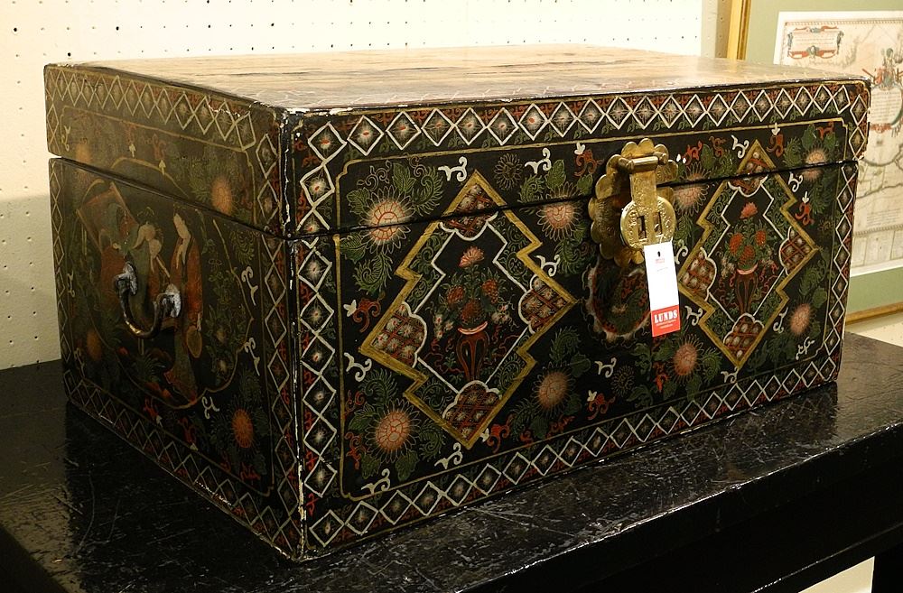 Chinese Painted Leather Chest, 12 1/8" x 24 3/4" x 16 1/8", (some splitting noted).