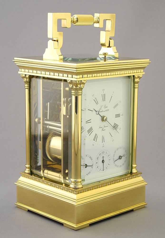 LOT 23 L'Epee Sainte-Suzanne France 1/4 Striking Calendar and Alarm Carriage Clock, 7 5/8" x 4" x 3 1/2 Estimate: $1,500 - $2,000 Sold For: $1,500 Auction Date: Tuesday, August 29 2023 at 4:00 PM