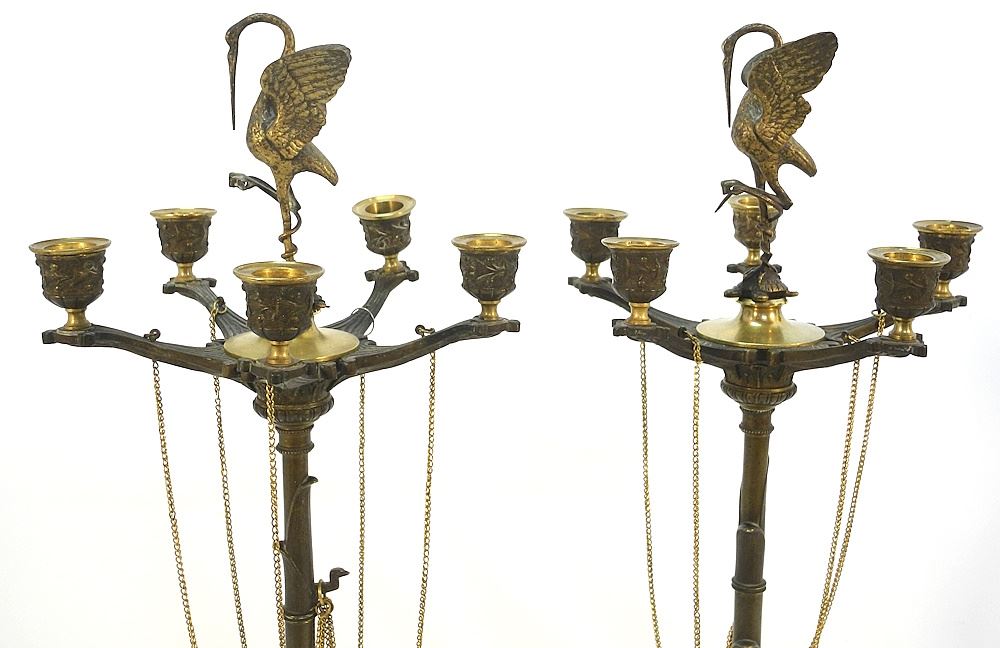 LOT 15 Pair of 19th Century French Bronze "Crane" Candleabra, 24 1/2" High. Estimate: $1,500 - $2,500 Auction Date: Tuesday, August 29 2023 at 4:00 PM