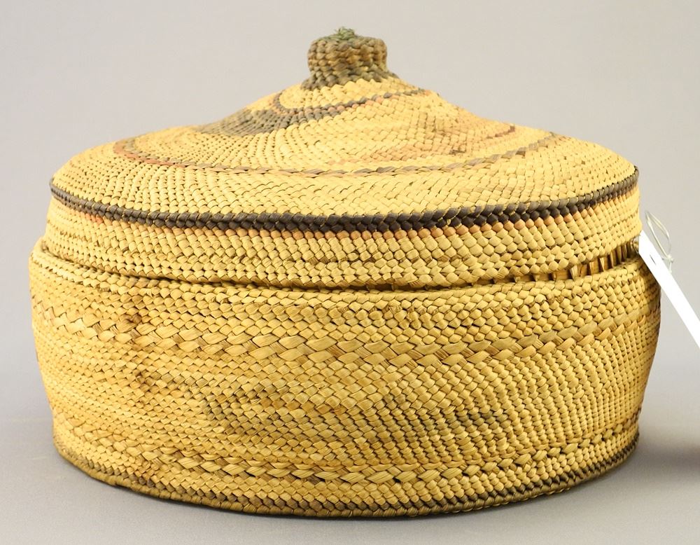 LOT 155 Nuuh-Chah-Nulth Covered Basket, 7 3/4" diameter, "Whaling". Estimate: $200 - $400 Sold For: $400 Auction Date: Tuesday, August 29 2023 at 4:00 PM