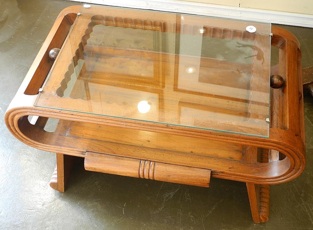 Art Deco Rosewood Glass Top Coffee Table, 19 3/4"H x 31"L x 16"D.