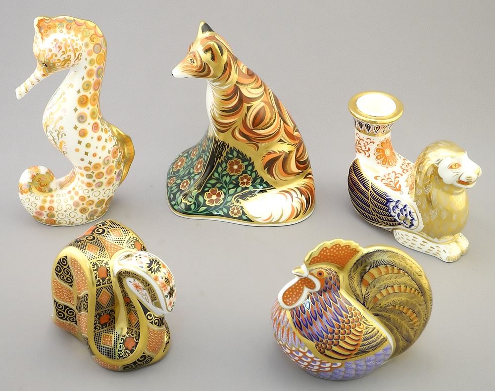 LOT 133 5 Royal Crown Derby Paper Weights: Rooster, Snake, Swirl Seahorse, Vixen, etc. Estimate: $200 - $300 Sold For: $110 Auction Date: Tuesday, August 29 2023 at 4:00 PM