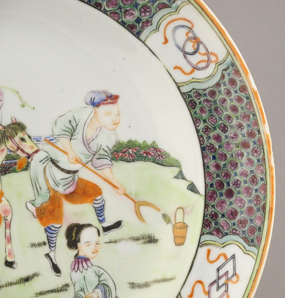 Pair of Chinese Famille Rose 9 3/4" Diam. Porcelain Figure on Horseback Dishes (nibbed edges noted