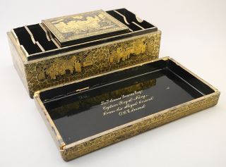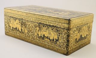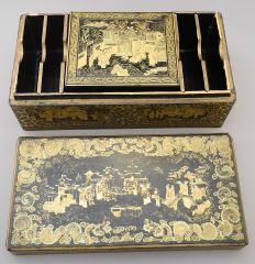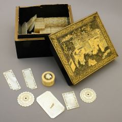 LOT 78 Mid 19th C. Cantonese Inscribed Lacquer Games Box with Mother of Pearl Counters. Estimate: $200 - $400 Sold For: $650 Auction Date: Tuesday, October 24 2023 at 4:00 PM