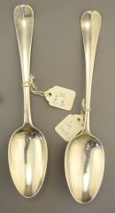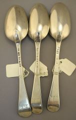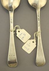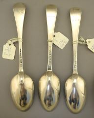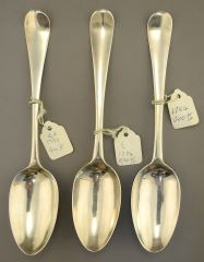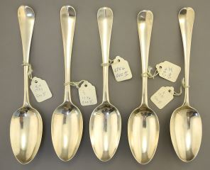 LOT 108 5 George III Hallmarked Silver Table Spoons: Various Makers / London, 319 Grams, 8 - 8 1/8"L. Estimate: $200 - $300 Sold For: $250 Auction Date: Tuesday, October 24 2023 at 4:00 PM