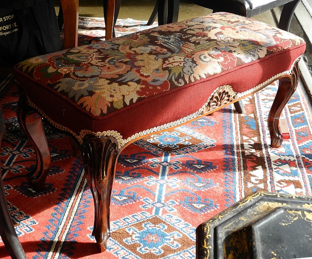 LOT 44 Gloss Mahogany Cabriole Leg Needlepointed Footstool, 16 1/2" x 32" x 14 1/4". Estimate: $80 - $140 Sold For: $80 Auction Date: Tuesday, October 24 2023 at 4:00 PM