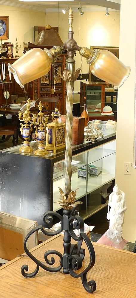 LOT 16 Bronze & Cast Iron Dual Branch Lamp with Iridescent Shades, Indistinctly Monogrammed, 39 1/2"H. Estimate: $200 - $400 Auction Date: Tuesday, October 24 2023 at 4:00 PM