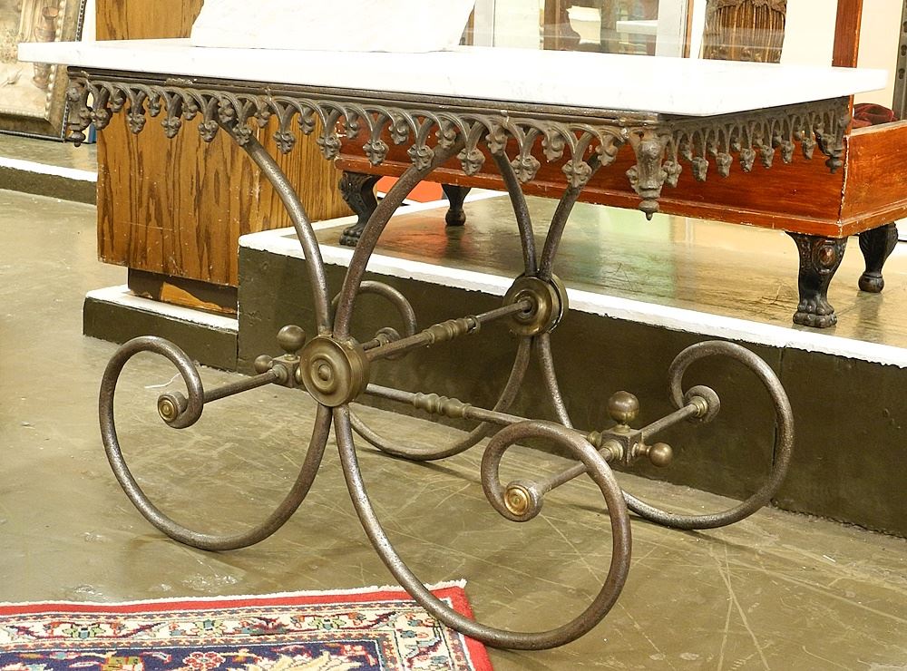 LOT 124 19th Century French Cast Iron Bakers Table with Marble Surface, 28 1/4 x 43 x 25 3/8". Estimate: $300 - $500 Sold For: $700 Auction Date: Tuesday, October 24 2023 at 4:00 PM