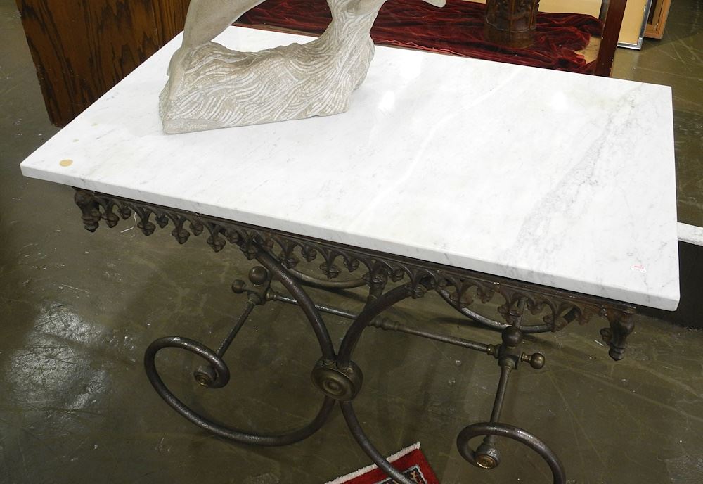 19th Century French Cast Iron Bakers Table with Marble Surface, 28 1/4 x 43 x 25 3/8".