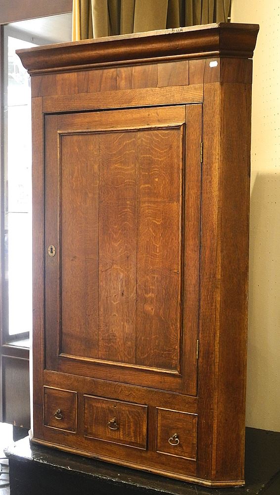 LOT 55 Georgian Oak Corner Cupboard with Three Drawers, 48" in Height. Estimate: $200 - $300 Sold For: $200 Auction Date: Tuesday, October 24 2023 at 4:00 PM