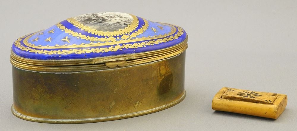 Early 19th C. Enameled Brass Box with Putto Decorated Cover, 1 5/8" x 3 1/2" x 2 1/8" & Snuff