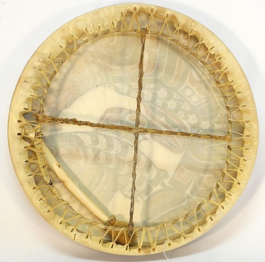 Kwagiulth Drum signed E.A.Hunt, 24 3/4", "Eagle & Salmon".
