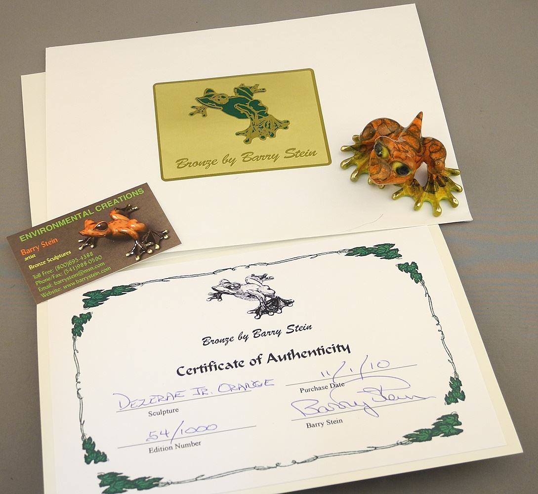 LOT 192 Bronze signed Barry Stein, 3", "Dezerae Jr. Orange Frog", #54/1000, with Certificate. Estimate: $100 - $150 Sold For: $90 Auction Date: Tuesday, December 12 2023 at 4:00 PM